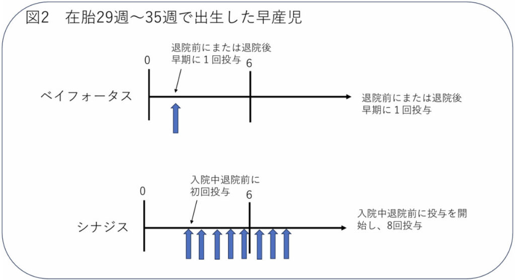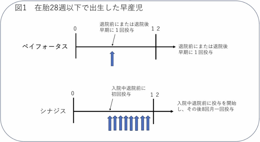 - 投与開始時期はNICU退院前(あるいは退院後初回外来時)または基礎疾患診断時とする。重症化リスクの高い低月齢の児を守るのが基本方針である。