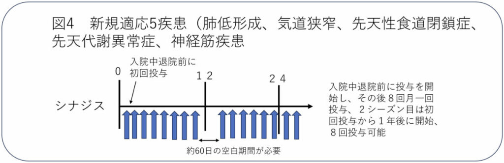 4. 方針移行期の今回に限り、2026年3月時点で3クール目のシナジスを投与している児は、3クール目を完遂してよいものとする。